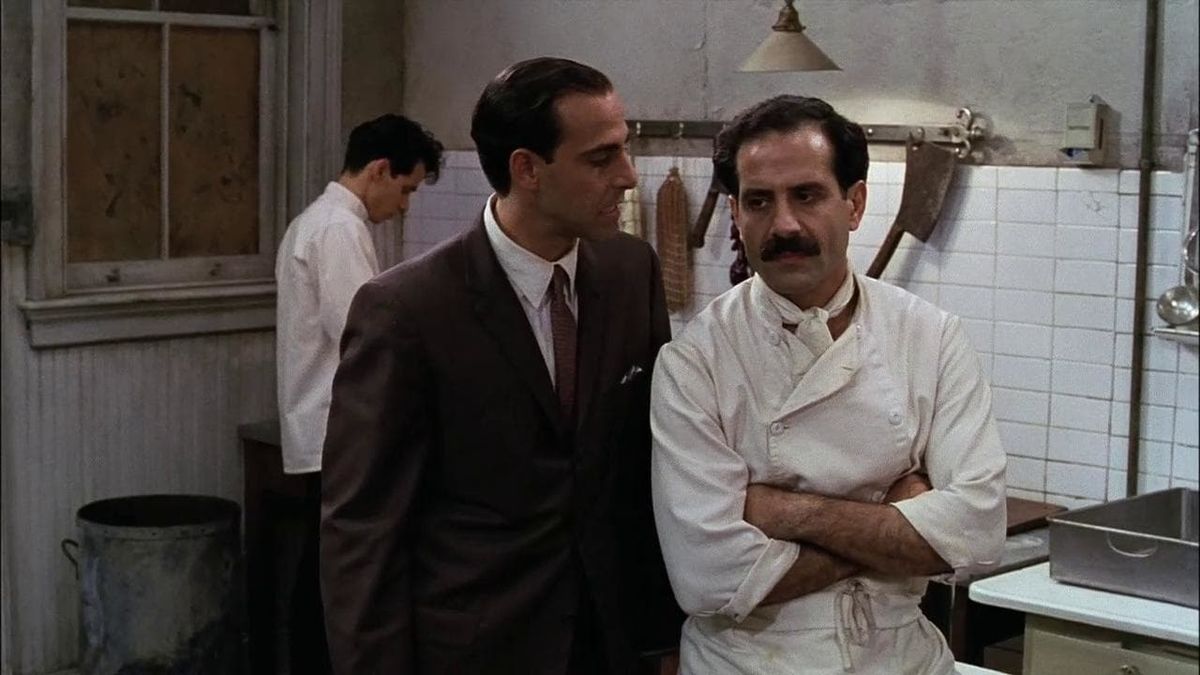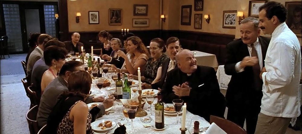 This meta-context directly leads to the creative conflict and dilemma of art vs. commerce. “People should come just for the food.” – Primo exclaims repeatedly. Although art can have inherent value, the film also makes a credible case for entertainment not only from the characters’ point of view, but embedded in the structure that places a high value both on depth and joy. The thematically rich screenplay (written by Tucci and Joseph Tropiano), the detailed art direction (with food-porn to boot), the fluid cinematography and the precise editing create a piece that draws the viewer in while the tone, the characters and their motivations are more complex and ambivalent than in films designed for a large audience. Mirroring this, the film makes fun of philistine Americans expecting commoditized versions of Italian food. Yet, Big night is so entertaining precisely due to the accessible treatment of such themes as enjoying life, love, community, food and music, and how this shared engagement with the physical/material can unexpectedly become a near sacral and ecstatic experience. “Give to people what they want. Then, later, you can give them what you want.” – Says Pascal.